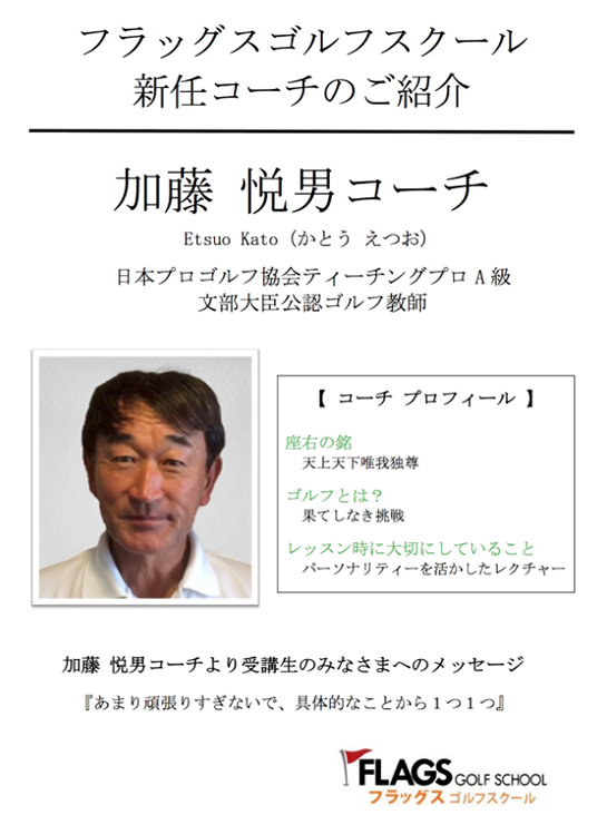 2017年7月より、新しく志木校のレッスンを担当します加藤 悦男コーチです。
