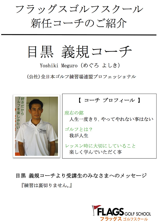 2017年8月17日より、新しく志木校のレッスンを担当します目黒 義規コーチです。