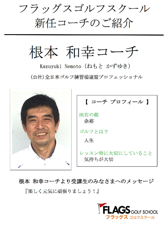 2017年11月より、新しく北本校と桶川校のレッスンを担当します根本 和幸コーチです。
